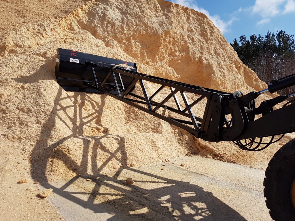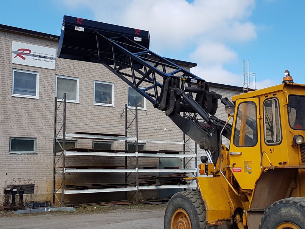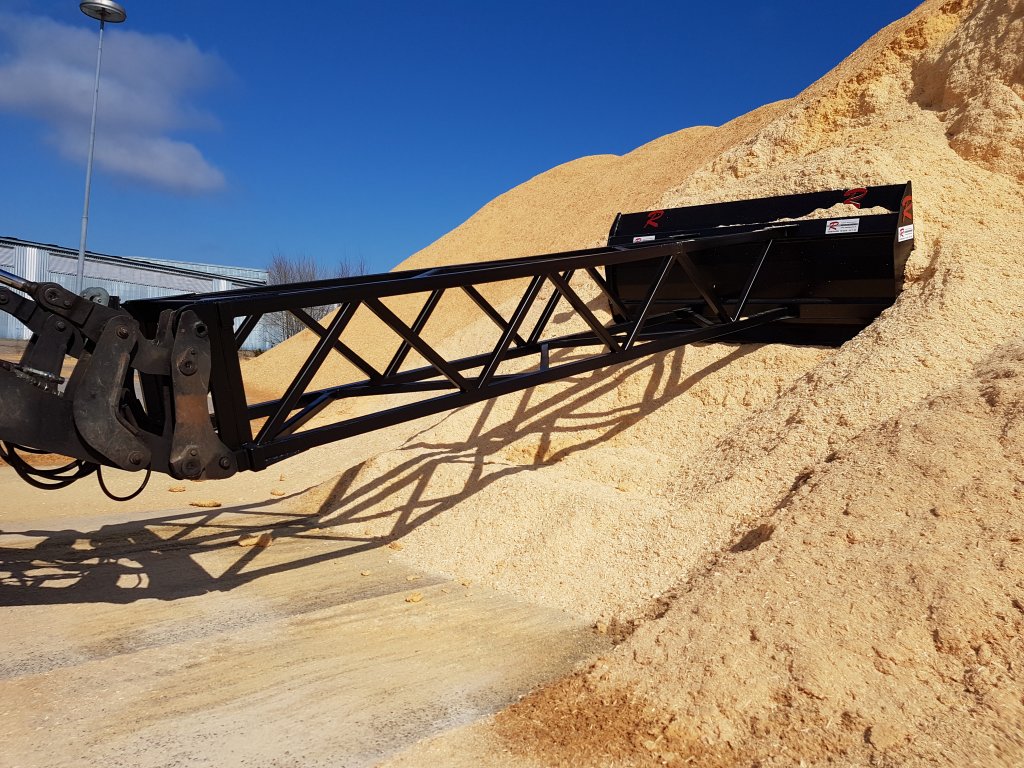 Flisraka FS 300 är en smidig och effektiv flisskrapa med en bredd på 300 cm och en höjd på 137 cm. Med en 5 meter lång arm är den anpassad för att enkelt samla och stapla flis, spån och andra material.